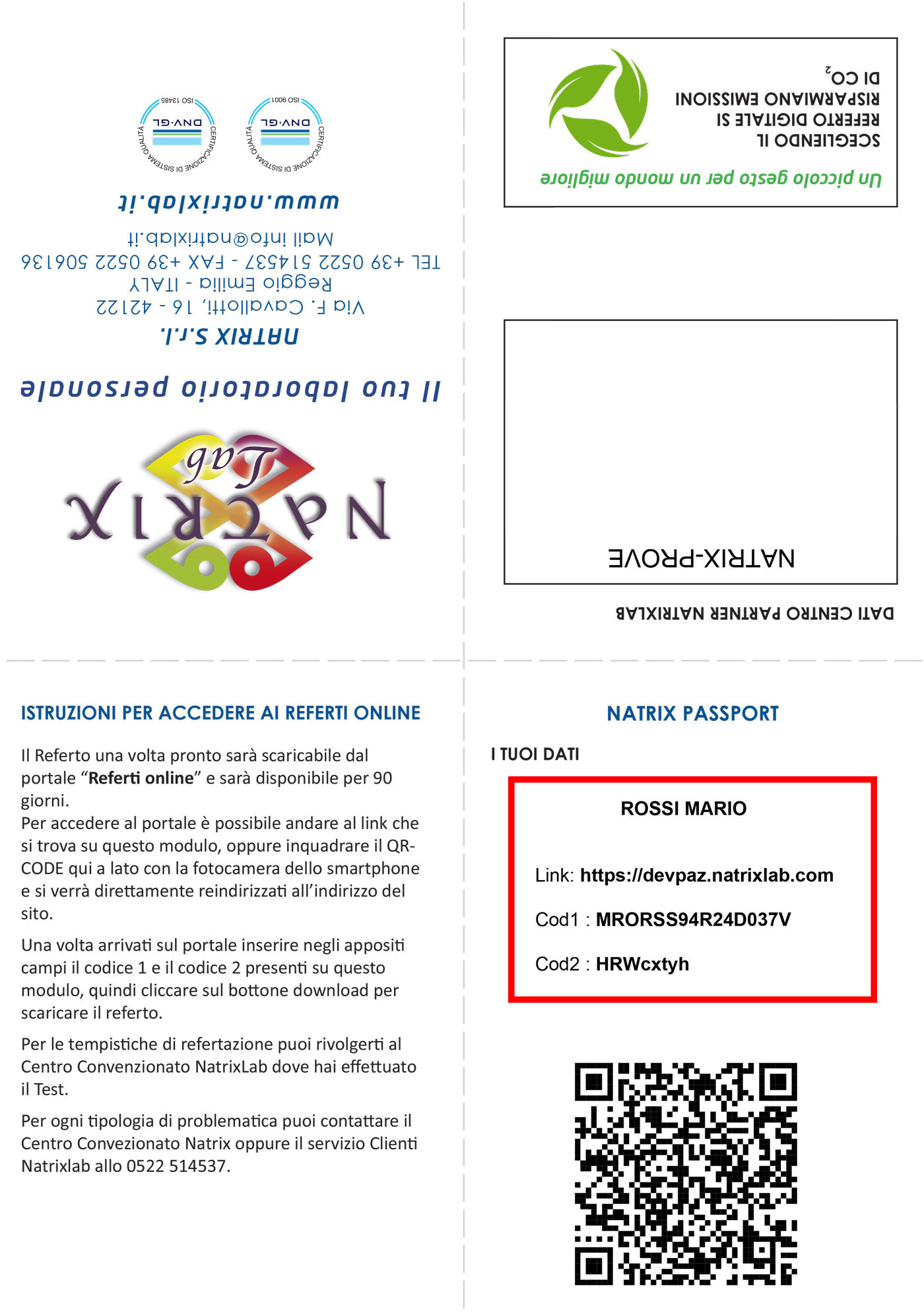 Guardare la sezione del modulo "Natrix Passport" (come indicato qui a lato in foto) e inserire il "Codice 1" ed il "Codice 2" qui sul portale nei campi appositi, quindi cliccare si "Download" per scaricare il referto.