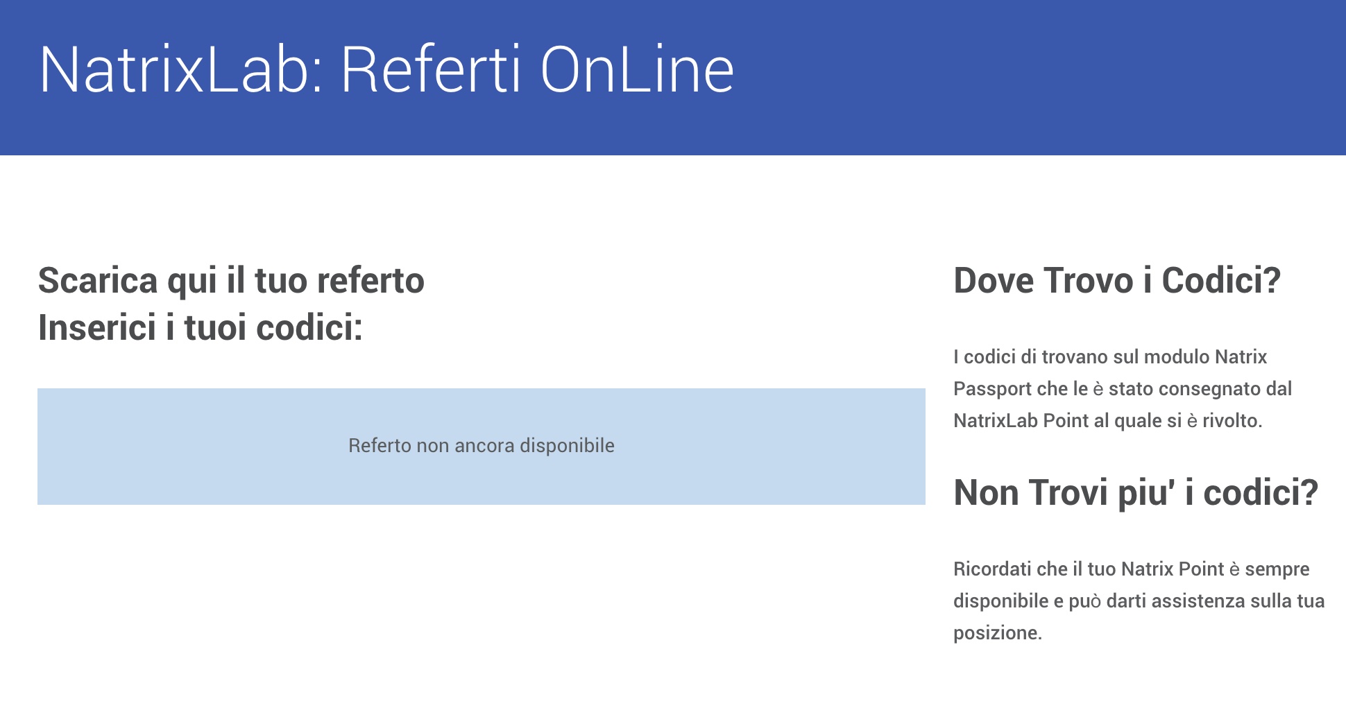 Per scaricare il referto è necessario essere in possesso del modulo personale "Natrix Passport" consegnato dal NatrixLab Point.